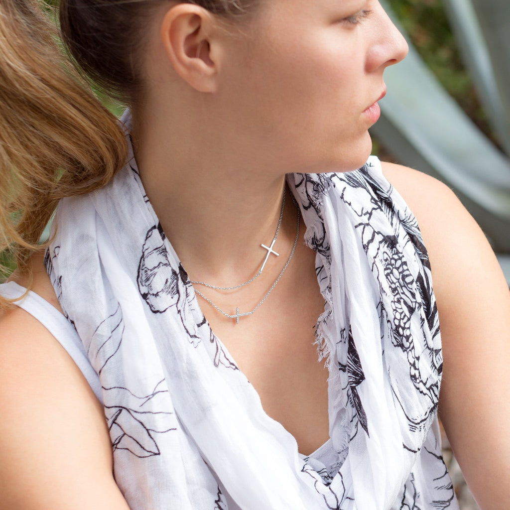 16" + 2" Rhodium Plated CZ Sideways Cross Necklace