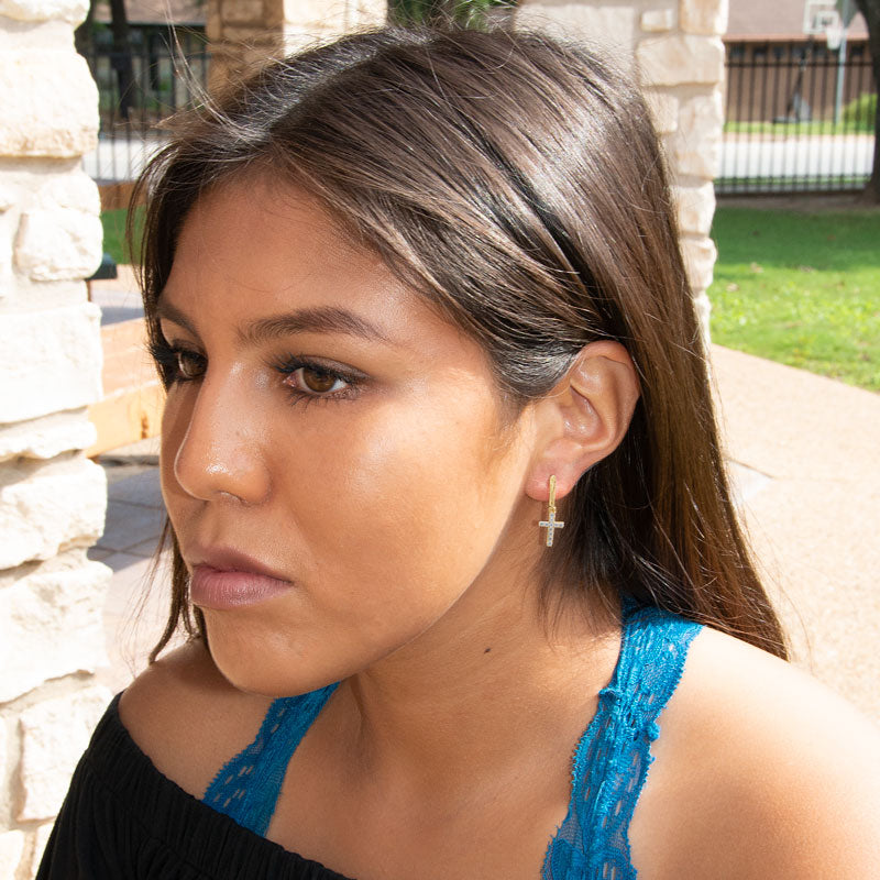 14 Karat Gold Plated Hoop Earrings with CZ Cross