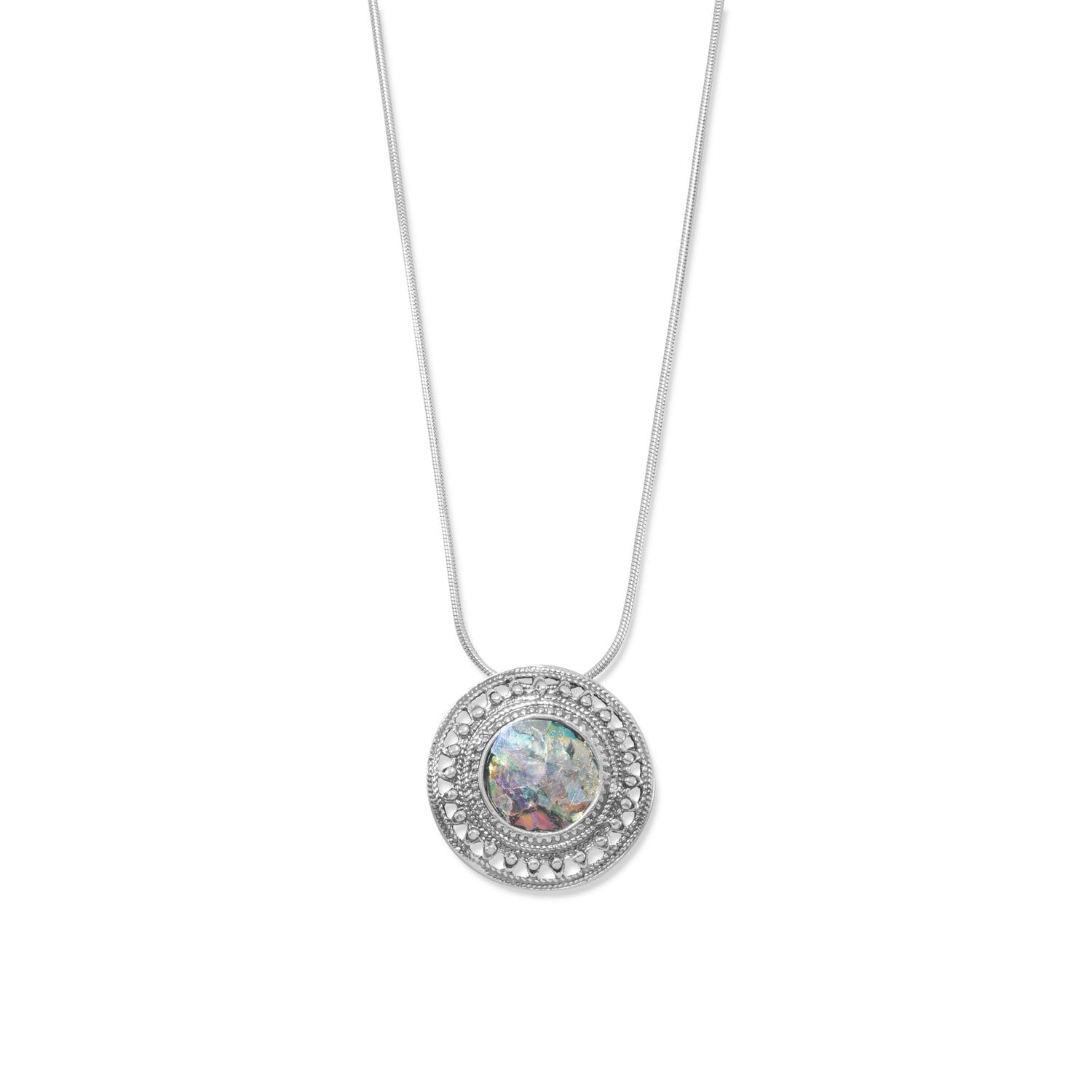 1mm wide snake chain with lobster clasp. Pendant measures 23mm in diameter with 11mm ancient glass center.Roman glass color will vary. Comes with Certificate of Authenticity. .925 Sterling Silver