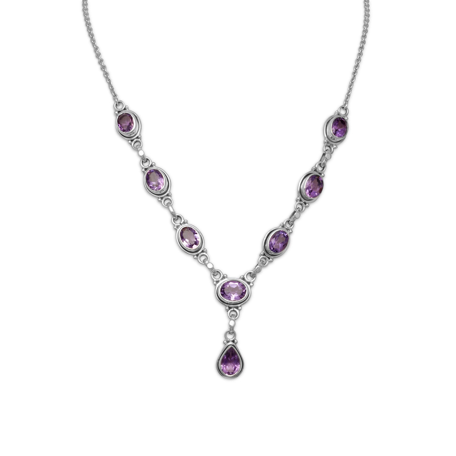 15"+1" extension sterling silver amethyst drop necklace. Necklace contains six 7 x 5mm oval faceted amethyst, one 10 x 7mm oval faceted amethyst and the faceted pear shape drop measures 9.5 x 7mm. .925 Sterling Silver