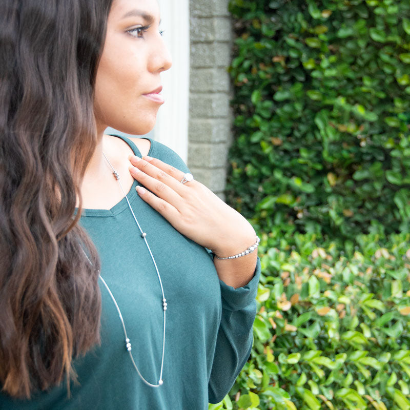 Silky smooth rhodium plated sterling silver .9mm snake chain with 4mm, 5mm and 6mm bead stations throughout. A statement worn alone or perfect for layering with multiple shorter chains and necklaces. Lobster clasp closure. Made in Italy .925 Sterling Silver