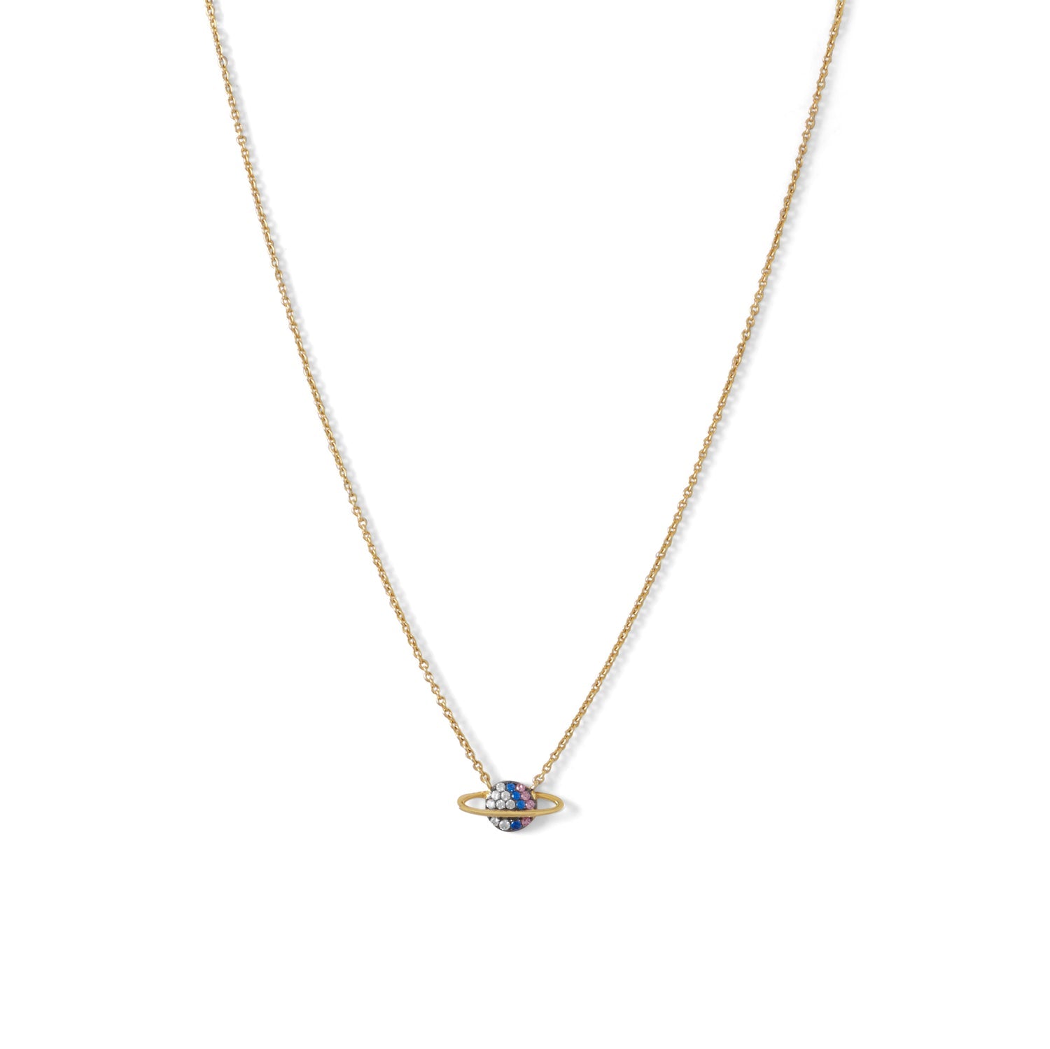 16" + 2" extension 14 karat gold plated sterling silver cable chain necklace featuring a 15mm x 7mm mini planet pendant covered in 1.2mm clear, blue, and baby pink CZ's. This necklace has a lobster clasp closure. .925 Sterling Silver