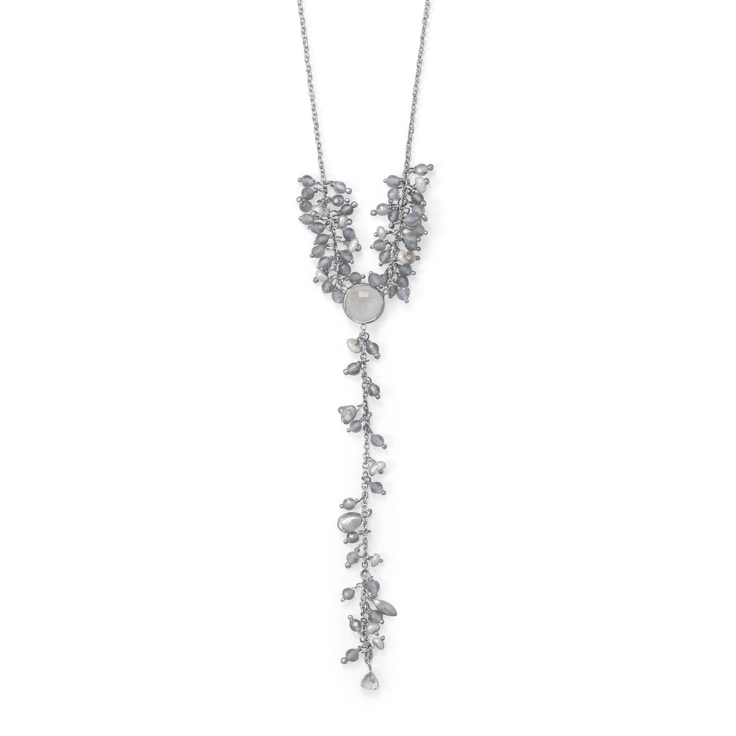 Festive fashion. 20" with 2" extension rhodium plated sterling silver drop necklace features cultured freshwater pearl, labradorite and rainbow moonstone. Beaded pearl and labradorite measure 2-3mm, and large, central rainbow moonstone measures 9mm in diameter. Necklace features a lobster clasp closure. .925 Sterling Silver