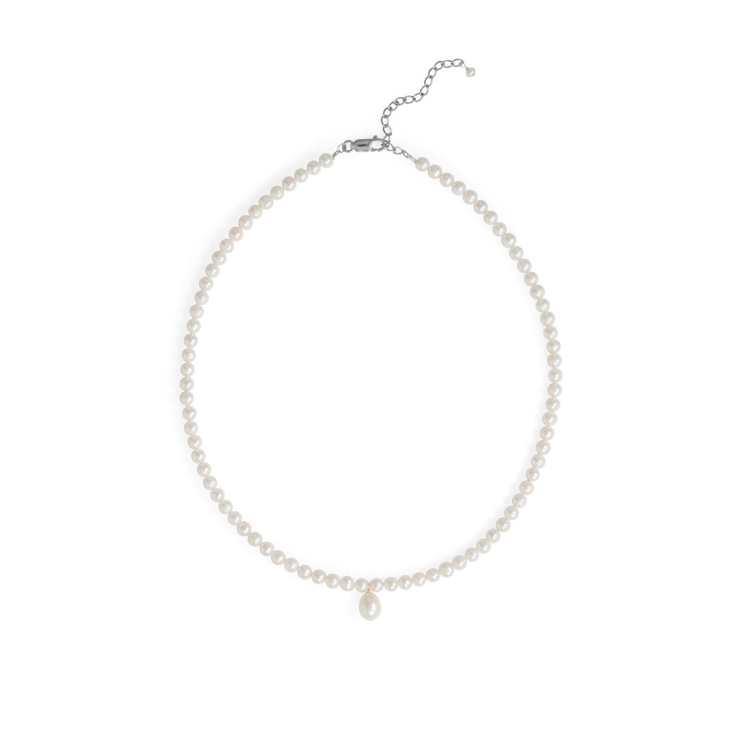 Simple elegance. 16" necklace with 2" extension necklace features 5mm cultured freshwater pearls with a 7.5mm x 9.5mm cultured freshwater pearl drop. Finished with a rhodium plated sterling silver lobster clasp closure. .925 Sterling Silver **Length can be customized upon request for an additional charge. Contact us for details.