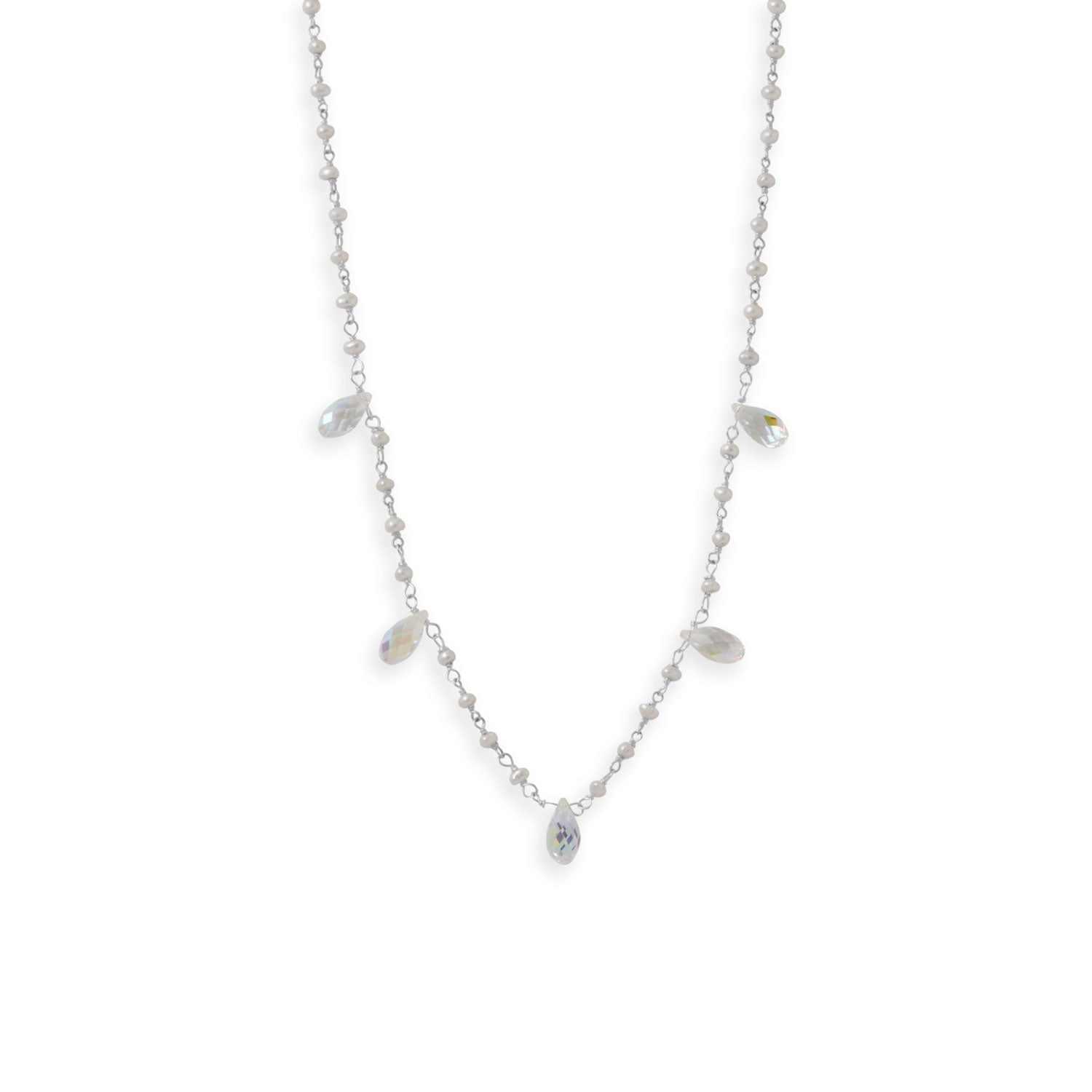 Bridal perfection - poised, precious and plenty of pearls! 16" with 2" extension sterling silver necklace features AB Swarovski crystals and dainty 2-3mm cultured freshwater pearls. Featuring five raindrop-shaped Swarovski crystals measure 5.5mm x 11mm and finished with a lobster clasp closure. .925 Sterling Silver **Length can be customized upon request for an additional charge. Contact us for details.