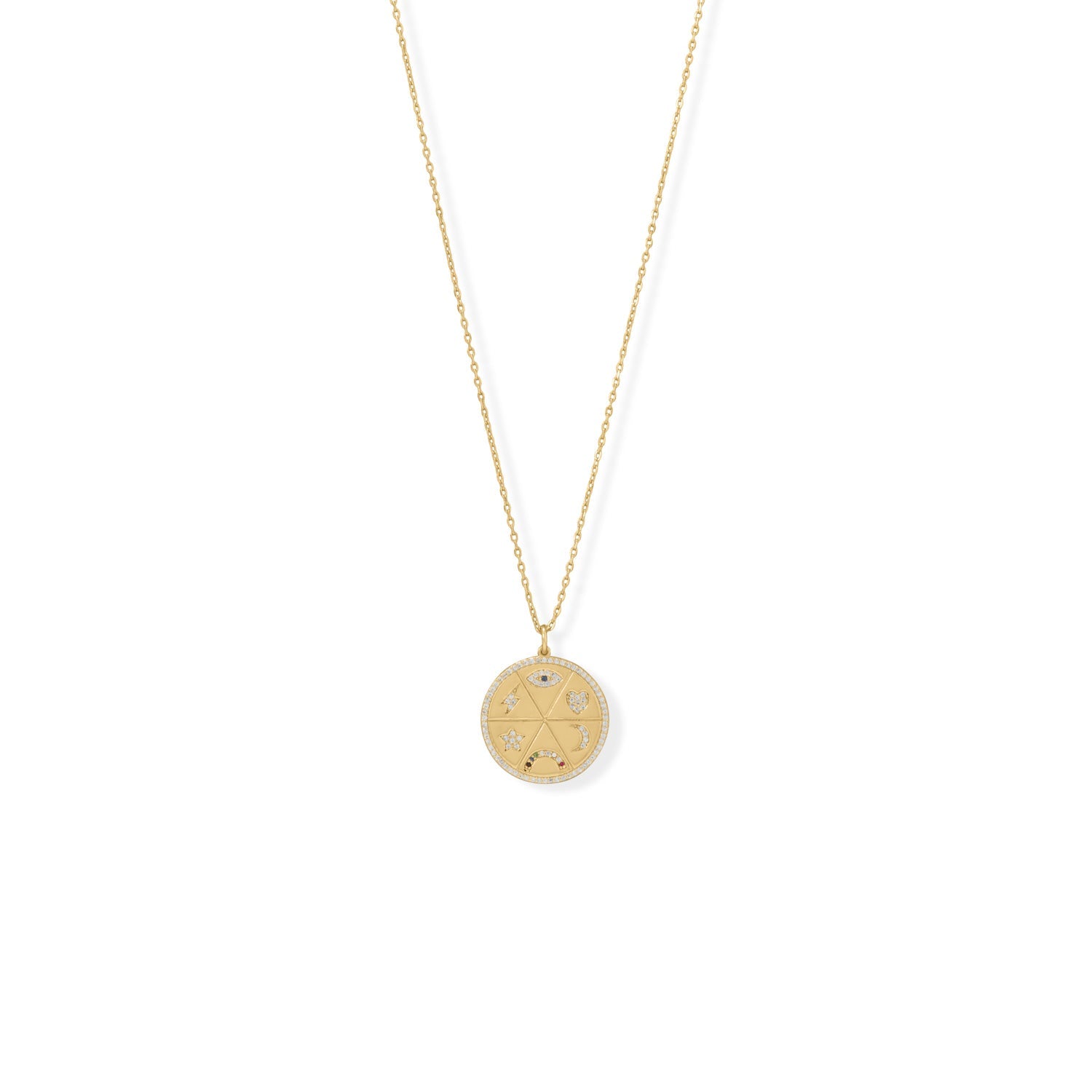 16" + 2" 14 karat gold plated necklace features a pave CZ encrusted celestial medallion. Medallion features a star, lightning bolt, evil eye, heart, crescent moon multi-color rainbow with a halo CZ edge. Measures 20mm in diameter and is finished with a lobster clasp closure. .925 Sterling Silver