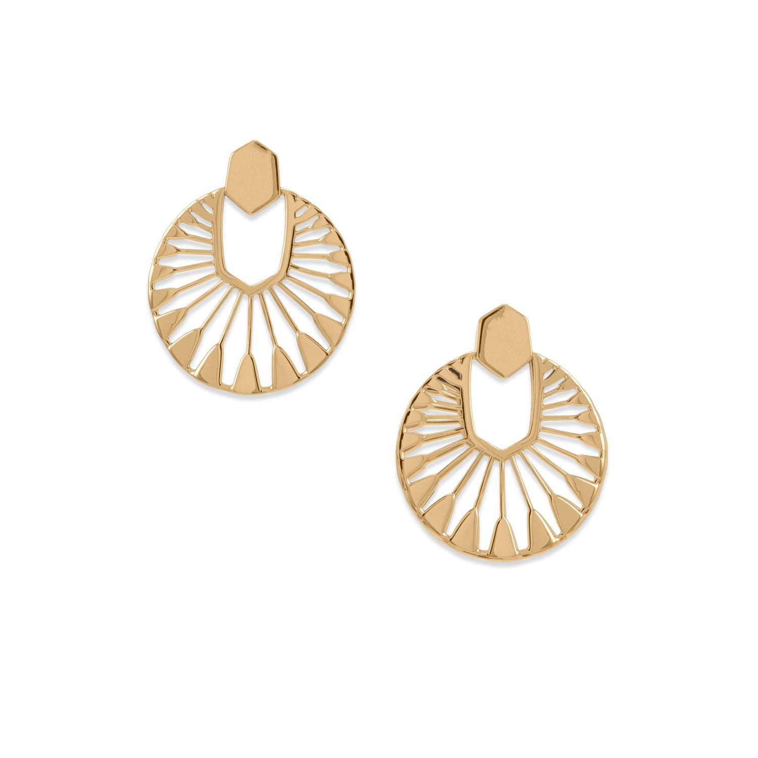 You'll look like a goddess in these gorgeous sun dial style geometric earrings! 14 karat gold plated sterling silver earrings feature a 32mm round geometric design drop. Post back earrings have a hanging length of 38mm. .925 Sterling Silver