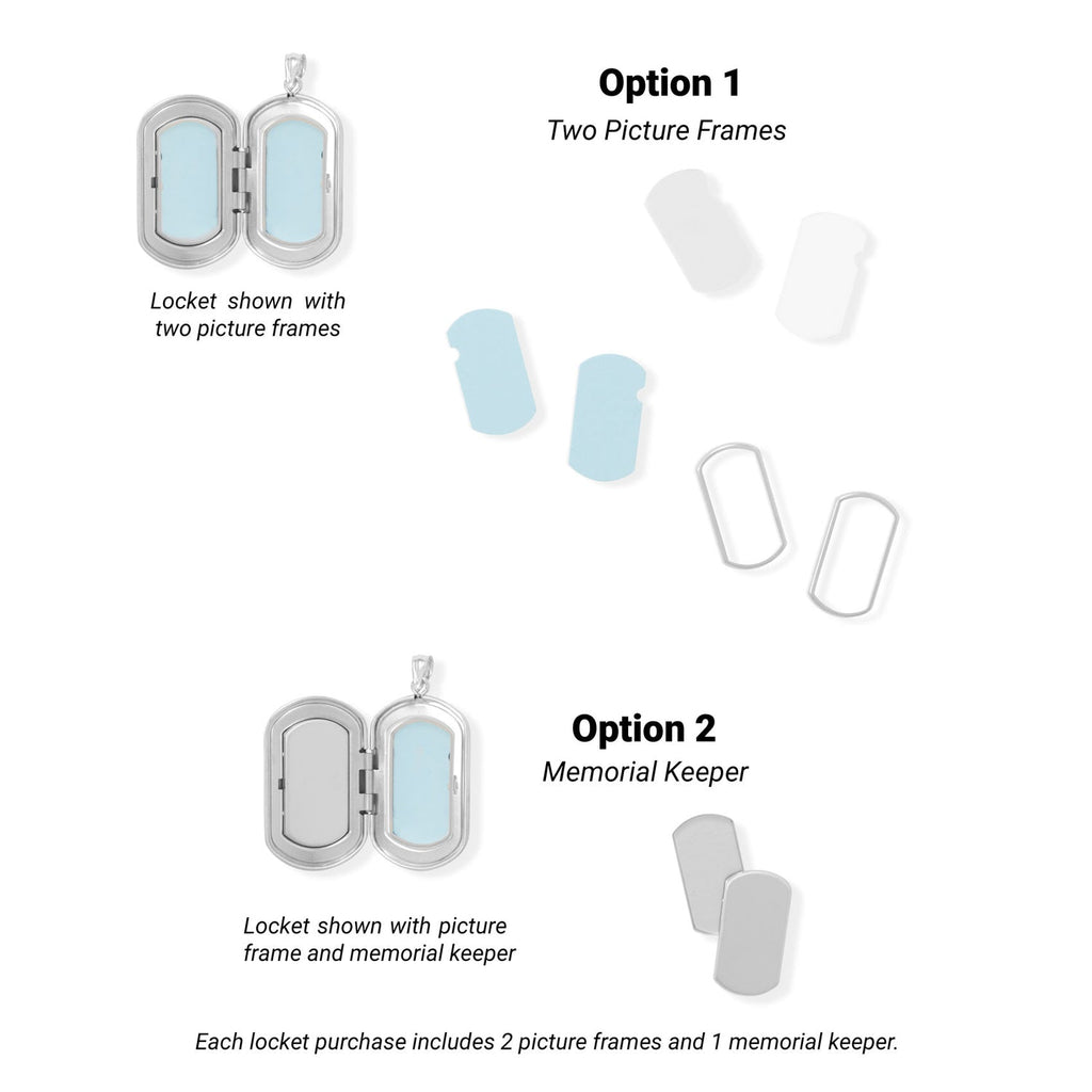 Keep your loved one close with this elegant locket. Center features and etched star design with diamond accent. Rhodium plated sterling silver pendant locket can accommodate two photos or one photo with the memory keeper. The memory keeper can be used to hold a small amount of cremains, a lock of hair or a written message. Front has a satin finish with polished edge, back has satin finish. Measures 19mm x 29.8mm and hanging length is 38.2mm. The back of this item or the memory keeper can be engraved for an additional charge. Learn more about engraving here. Frames and memory keeper are stainless steel. .925 Sterling Silver Customizing with a symbol? Please use code from symbol library to indicate placement of the symbol. Ex: Rose Jack = Rose (A1) Jack Note: Please allow up to five (5) business days for your personalized item to ship. If you prefer your non-engraved items be shipped immediately, please indicate that in the Order Notes at checkout; otherwise, your entire order will be held and shipped complete when engraving items are ready.