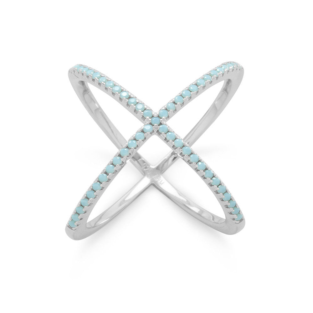 Rhodium plated sterling silver criss cross 'X' ring with blue CZs. The ring measures approximately 20mm. The turquoise blue CZs embellish the top of the ring, and the back is polished. .925 Sterling Silver