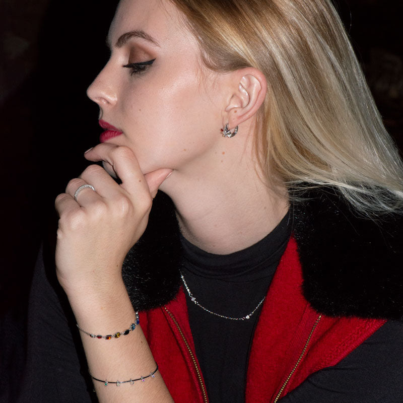 Perfect as a midi ring or for stacking! Rhodium plated sterling silver ring with 17 1.25mm CZ's across top. Band is 1.5mm and tapers down to 1.2mm. Available in whole sizes 3-9. .925 Sterling Silver