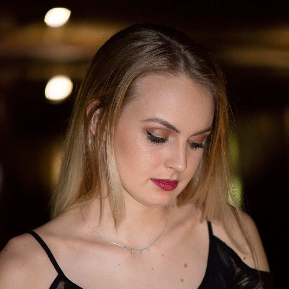 Charming necklace in 16" with 2" extension. Rhodium plated sterling silver with 5 tiny 2.7mm squares each holding one 1.6mm CZ on 1.1mm cable chain. Lobster clasp closure. .925 Sterling Silver